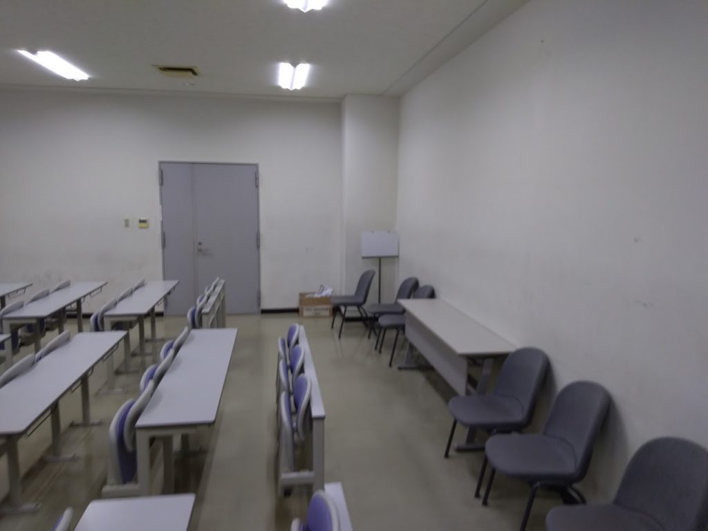 ◆会場内に段差はありません。会場内の机・椅子は固定されていますが、後方に車椅子が通行可能な広いスペースがあります。