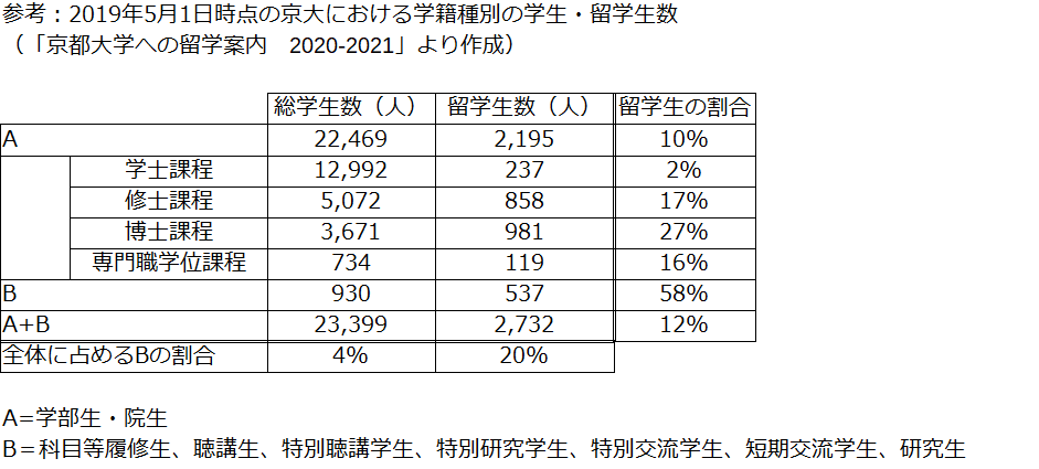 ※3 2019年時点で、京大の総学生数の12%である留学生が、学部生・院生以外の学生総数の58%を占める。留学生全体の約2割が学部生・院生以外の学籍である(出典:「京都大学への留学案内 2020-2021」)
