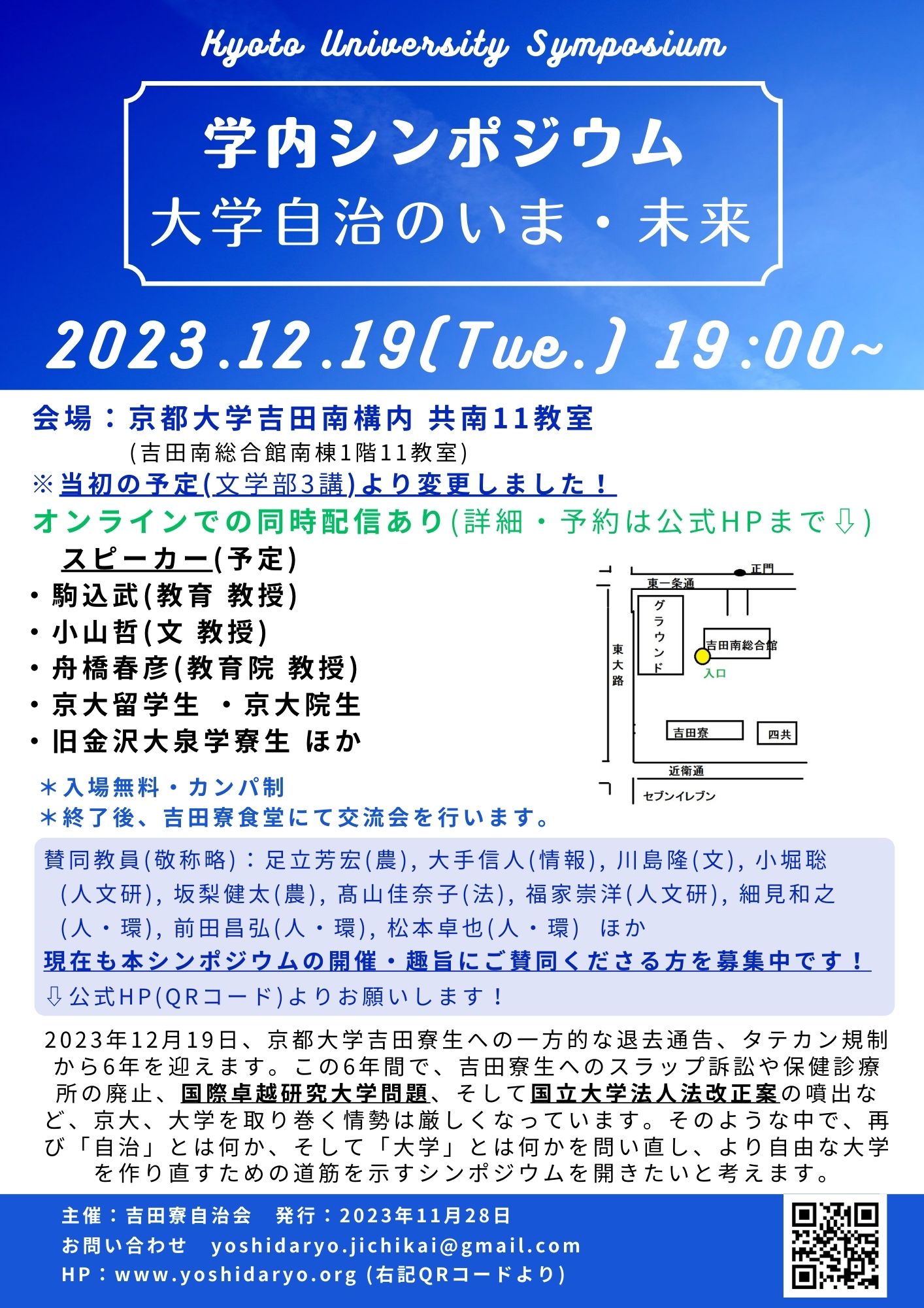 12月19日(火)夜に、吉田寮自治会が主催する学内シンポジウム「大学自治のいま、未来」が開かれます。
