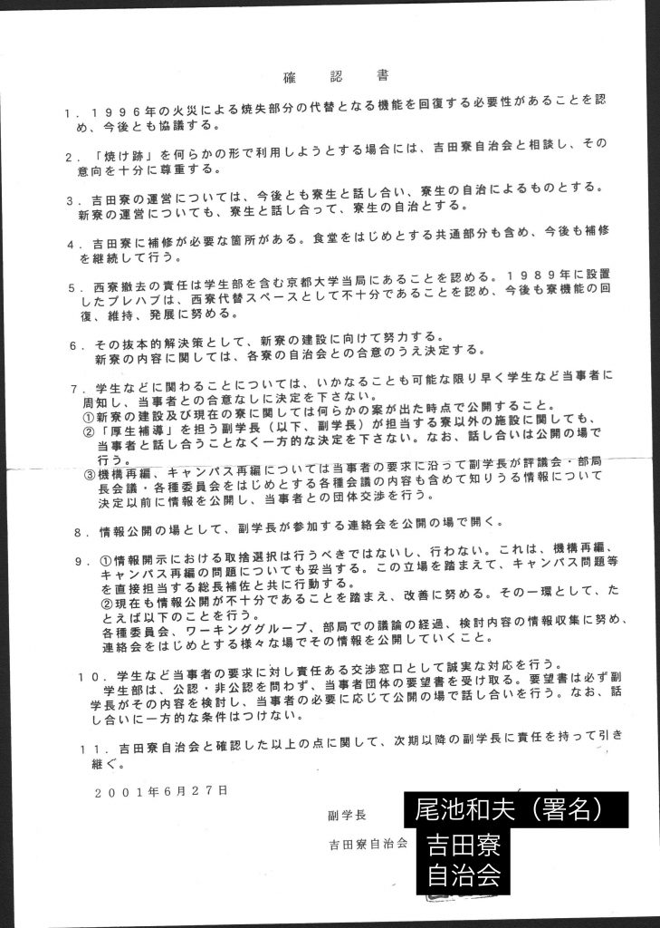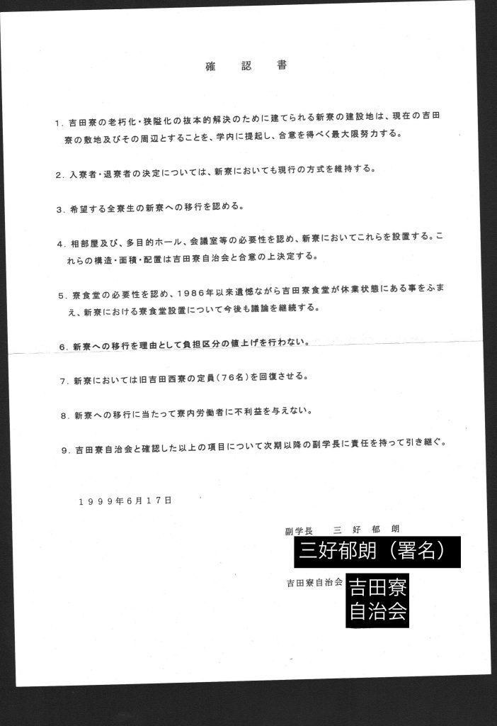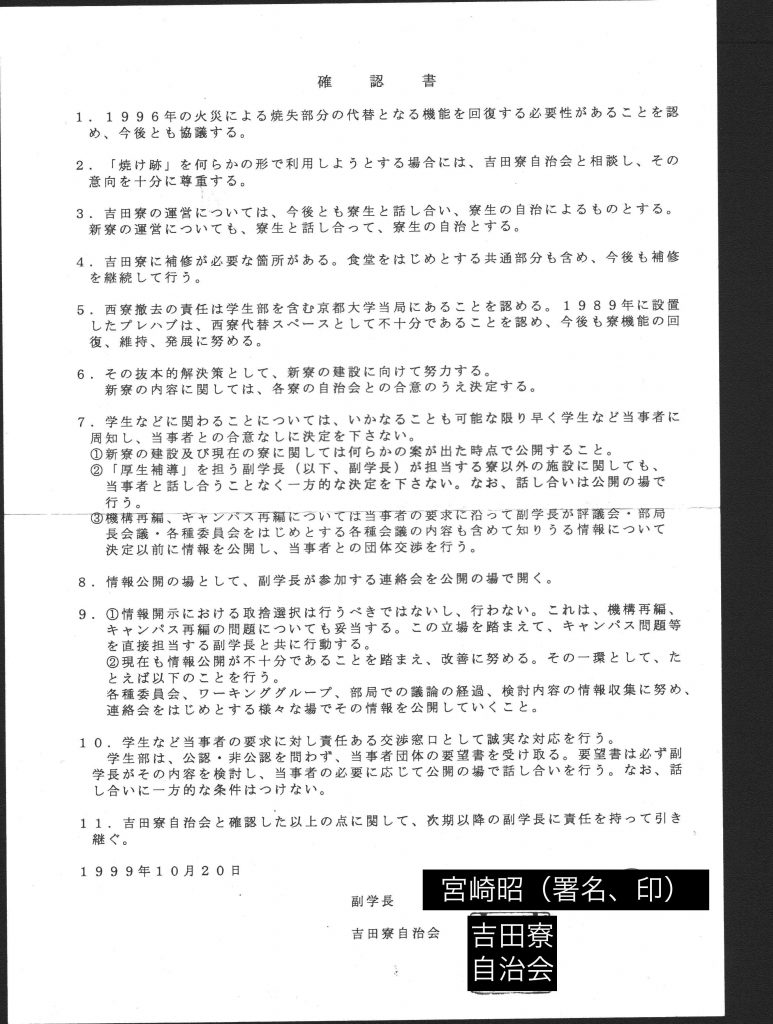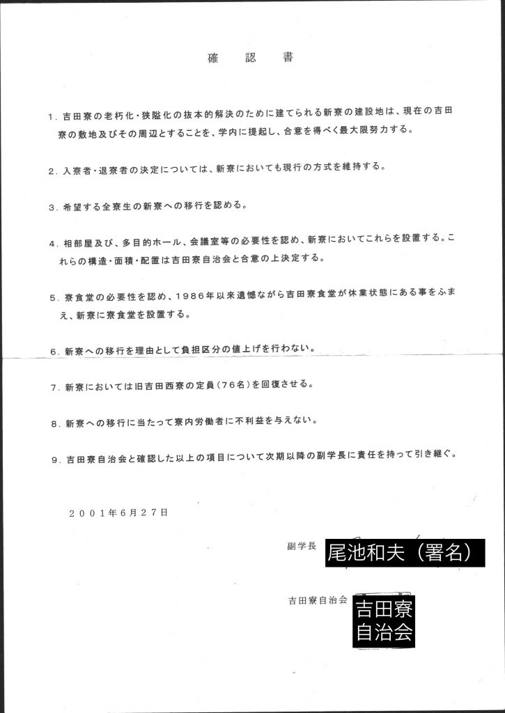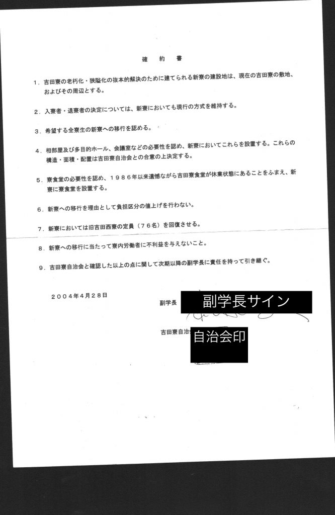 2009年10月9日 確約書A 注:副学長=「学生・教育」を担う副学長 新寮=吉田寮の新棟 新規寮=現在ある四寮以外の寮 項目1 吉田寮自治会と副学長西村周三は新寮・新規寮の建設と現吉田寮の老朽化対策について誠意を持って合意を形成する努力を行う。 項目2 大学当局は吉田寮の運営について一方的な決定を行なわず、吉田寮自治会と話し合い、合意の上決定する。また、吉田寮自治会が団体交渉を希望した場合は、それに応じる。 (印)吉田寮自治会 (署名) 副学長 西村周三 (手書き)私西村周三が本確約書にサインした動機は項目1について吉田寮自治会と確認できたことによる。