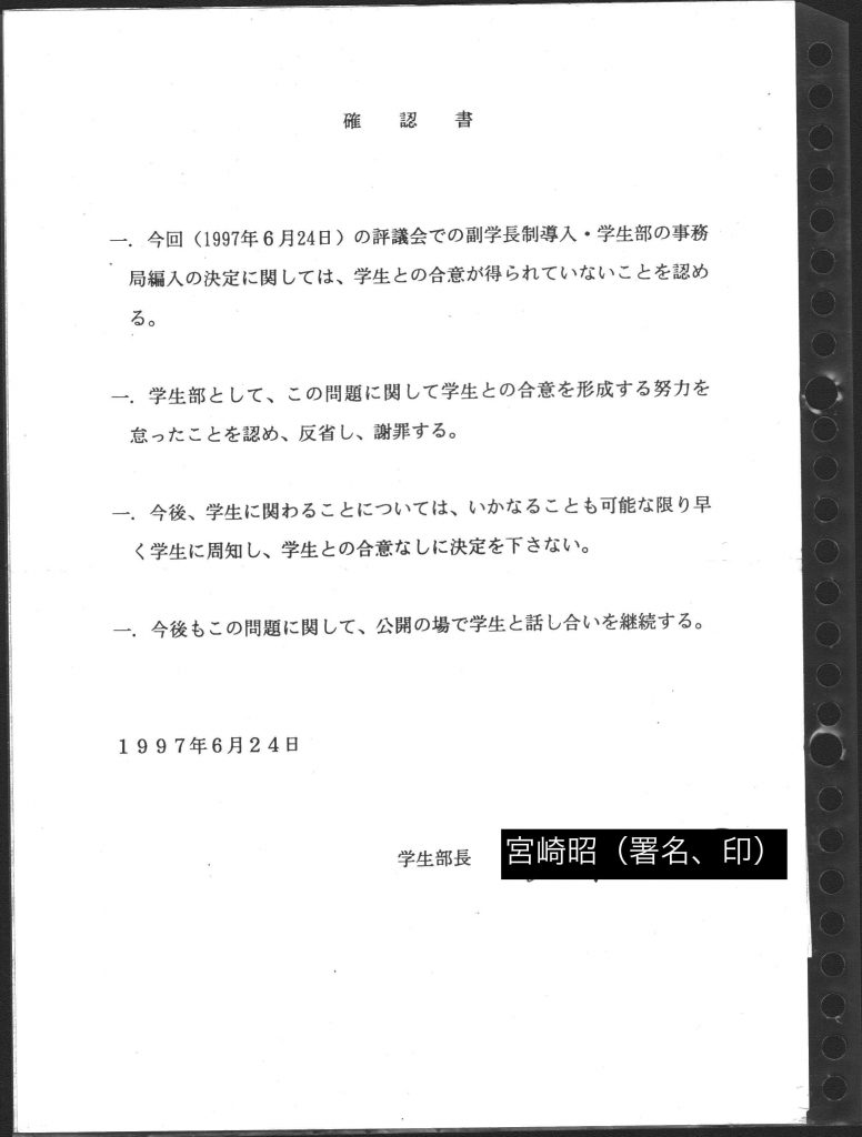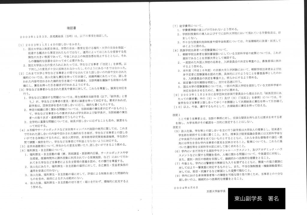 この確約は、長尾総長(当時)との総長団交の結果をふまえ、東山副学長(当時)がサインしたものである。 -