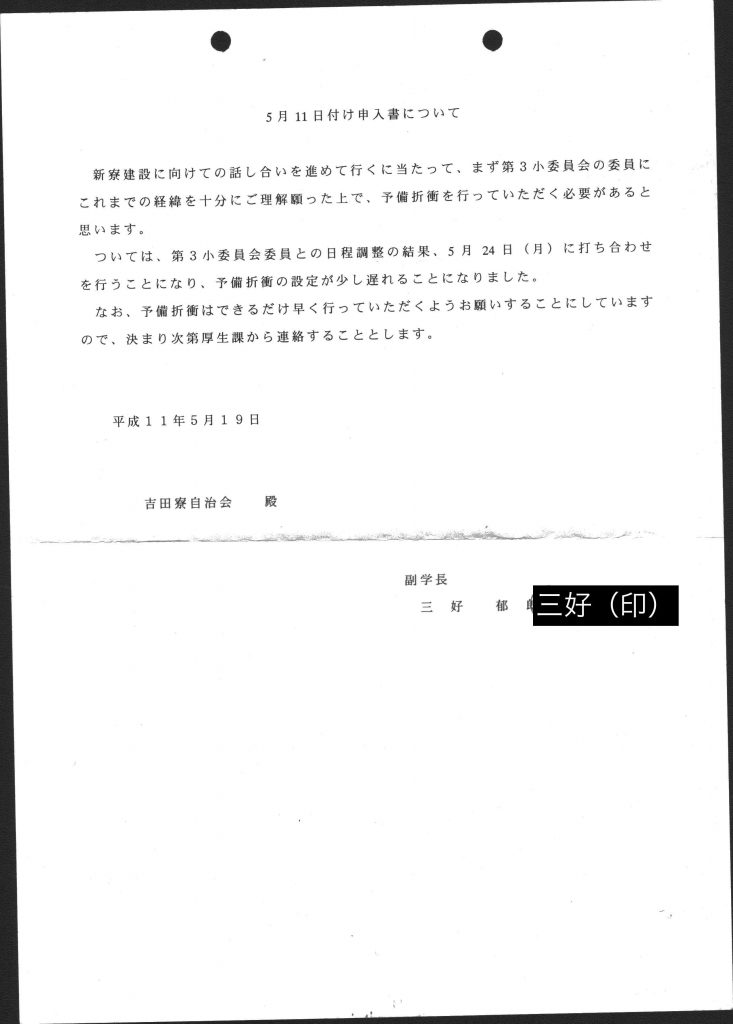新寮建設に関する確約書です。(三好郁朗副学長(当時)と締結) -