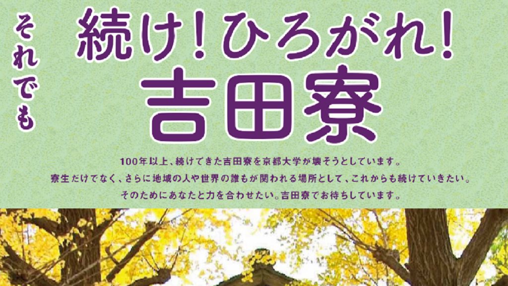 吉田寮の存続のため、ご支援をお願いしております。 吉田寮の現状につきましては、寮自治会が発信している声明やビラ類をご参照をいただけたらと思います。 声明はこちら ビラ類はこちら 【訴訟費用等カンパ金】 吉田寮では、現在一 … 続きを読む ご支援について
